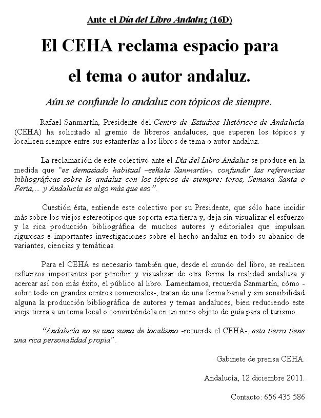 Para el CEHA es necesario también que, desde el mundo del libro, se realicen esfuerzos importantes por percibir y visualizar de otra forma la realidad andaluza y acercar así con más éxito, el público al libro. Lamentamos, recuerda Sanmartín, cómo -sobre todo en grandes centros comerciales-, tratan de una forma banal y sin sensibilidad alguna la producción bibliográfica de autores y temas andaluces, bien reduciendo este vieja tierra a un tema local o convirtiéndola en un mero objeto de guía para el turismo.